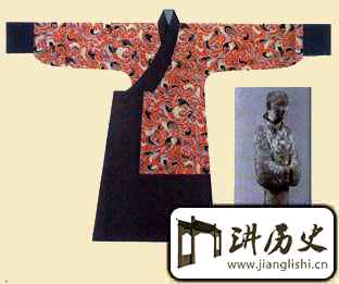 汉代直裾女服穿直裾袍服的妇女(汉代加彩陶俑)及汉代直裾女服展示图。汉代的直裾男女均可穿着。这种服饰早在西汉时就已出现,但不能作为正式的礼服。原因是古代裤字皆无裤裆,仅有两条裤腿套到膝部,用带子系于腰间。这种无裆的裤子穿在里面,如果不用外衣掩住,裤子就会外露,这在当时被认为是不恭不敬的事情。所以外要穿着曲裾深衣。以后,随着服饰的日益完备,裤子的形式也得到改进,出现有裆的裤子。由于内衣的改进,曲裾绕襟深衣已属多余,所以至东汉以后,直裾逐渐普及,并替代了深衣。