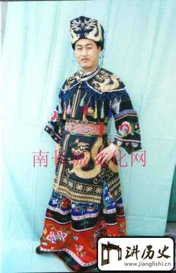 此款为湘西苗族古代苗王服饰,装头戴龙帽,边绣二龙抢宝图案,上嵌双龙戏珠银饰,项有银圈,手戴镯子,身穿刺绣龙服,下着绣花“巴缎”,腰系“金显”,脚穿绣花船型鞋。着上此装浓烈大方,极富民族特色。这种服饰在其它少数民族中不多见。
