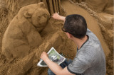 图为沙雕展中国区,其中包括了故宫、天坛、兵马俑以及秦始皇的巨型雕像。一名来中国的沙雕艺术家张伟康(Zhang Weikang)正在雕刻一堵城墙。