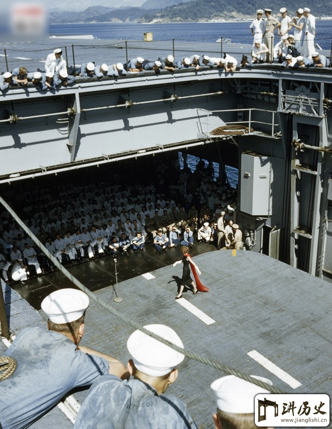 图为1959年9月9日,菲律宾苏比克湾,约克镇号航母上,一个uso的舞蹈家在甲板上表演舞蹈,美国大兵兴致高昂地围观着。