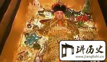 脚下置粉红碧玺莲花。头戴珍珠凤冠,冠上最大一颗珍珠大如鸡卵,价值一千万两白银。身旁放金、宝石、玉、翠雕佛爷27尊。脚下两边各放翡翠西瓜、甜瓜、白菜,还有宝石制成的桃、李、杏、枣200多枚。身左放玉石莲花,身右放玉雕珊瑚树。另外,玉石骏马八尊,玉石十八罗汉,共计700多件。葬殓完毕,又倒入四升珍珠,宝石2200块填棺……